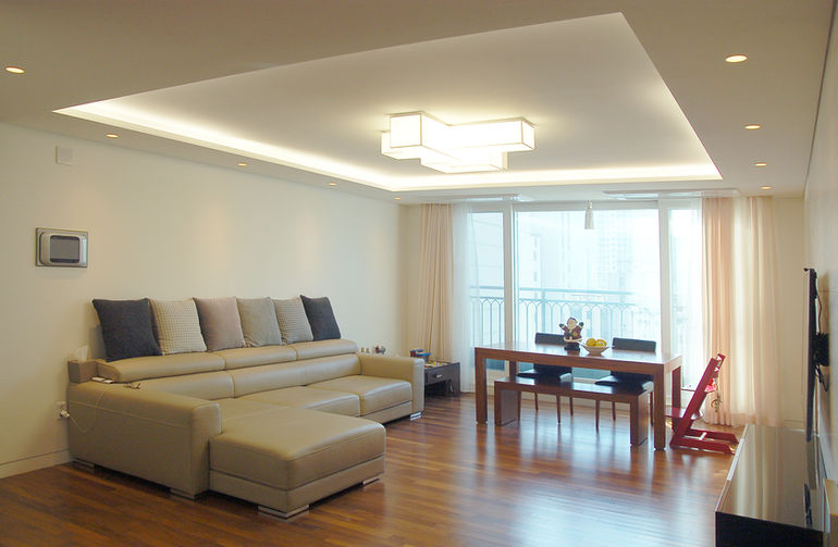 바닥은 무게감 잇는 티크 계열의 원목마루를 적용하여 전체적인 색을 누르는 요소로 안정감 있는 분위기를 조성하였으며